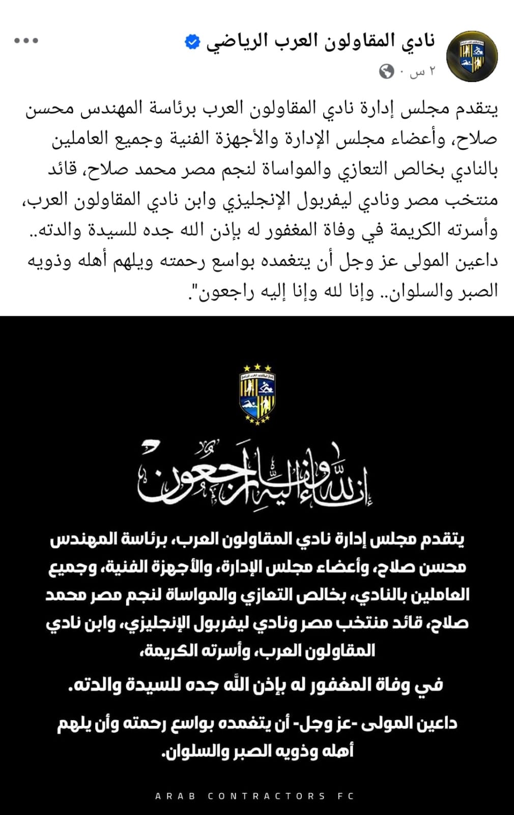 تقدم مجلس إدارة نادي المقاولون العرب، برئاسة المهندس محسن صلاح، وأعضاء المجلس، والأجهزة الفنية، وجميع العاملين بالنادي، بخالص التعازي والمواساة لـ محمد صلاح قائد منتخب مصر ونادي ليفربول الإنجليزي وابن نادي المقاولون العرب، ولأسرته الكريمة، في وفاة المغفور له بإذن الله “جده لوالدته”.