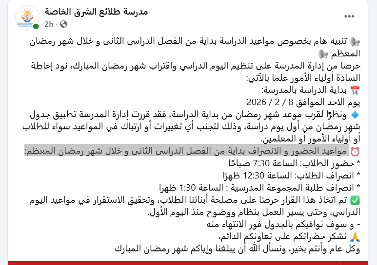 كما حسمت احدى المدارس الخاصة في المرج ، مواعيد الدراسة في رمضان 2026 مؤكدة أنها كالتالي :