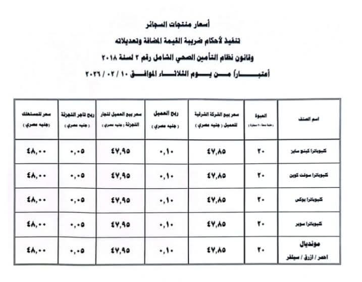 في المقابل، أعلنت شركة فيليب موريس مصر رسميًا تطبيق قائمة أسعار جديدة على منتجاتها من السجائر المستوردة ومنتجات التبغ المُسخن، اعتبارًا من 2 فبراير 2026، في خطوة أرجعتها الشركة إلى ارتفاع تكاليف التشغيل والاستيراد والنقل.