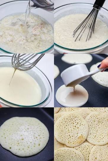 توضع المكونات الجافة جميعها وتقلب جيداً ثم يضاف إليها المياه تدريجياً للحصول على عجينة قوامها سائل، وبعد تحضيرها، يتم وضع مقلاة على نار هادئة غير قابلة للصق، ويأخذ جزء من العجينة بواسطة الكوب، ويتم سكبه على شكل دائرة بالحجم المفضل سواء صغيرة أو متوسطة وتركها تنضج.