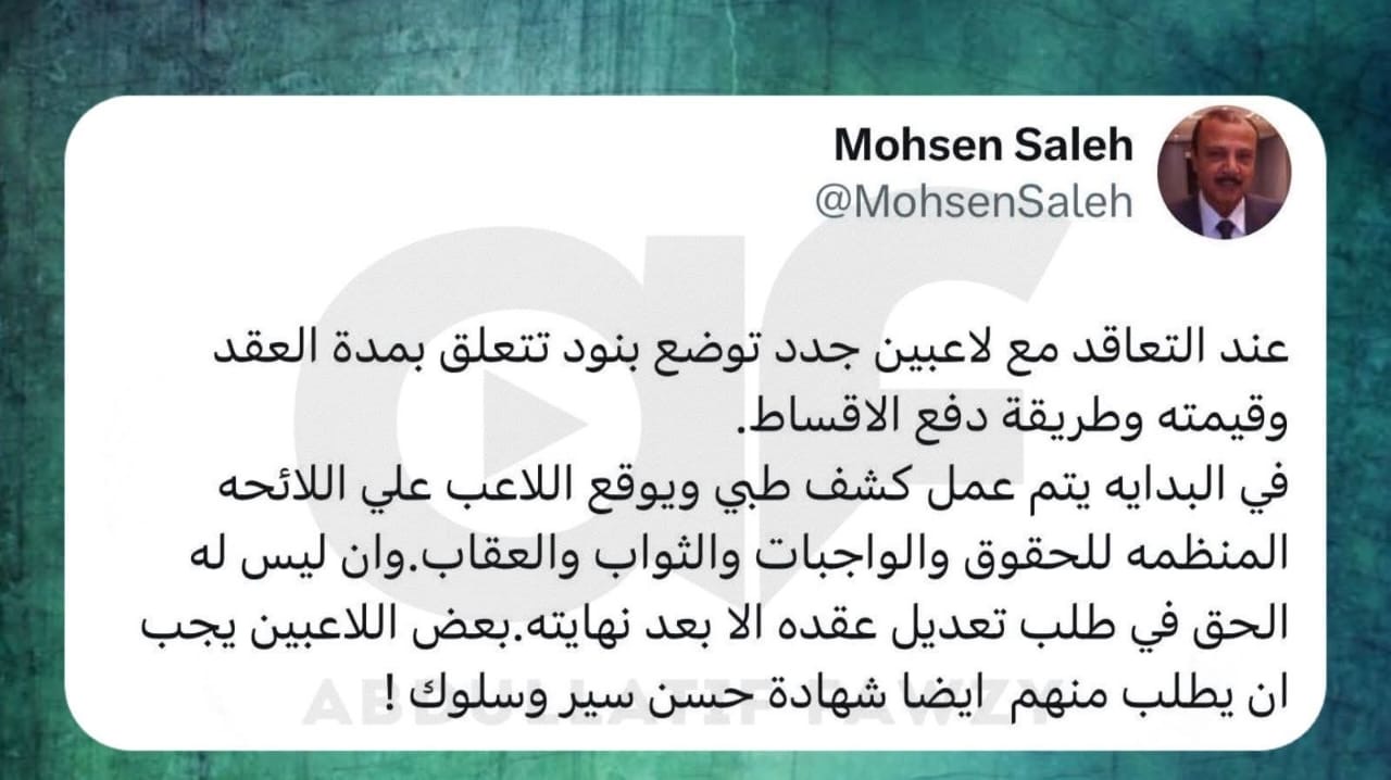 وقال محسن صالح، عبر حسابه الشخصي على منصة “إكس”: "عند التعاقد مع لاعبين جدد توضع بنود تتعلق بمدة العقد وقيمته وطريقة دفع الأقساط".