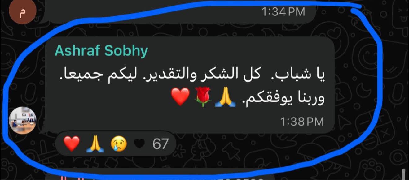 حرص الدكتور أشرف صبحي، وزير الشباب والرياضة علي توديع العاملين، برسالة شكر عبر جروب الوزارة على تطبيق واتس آب.