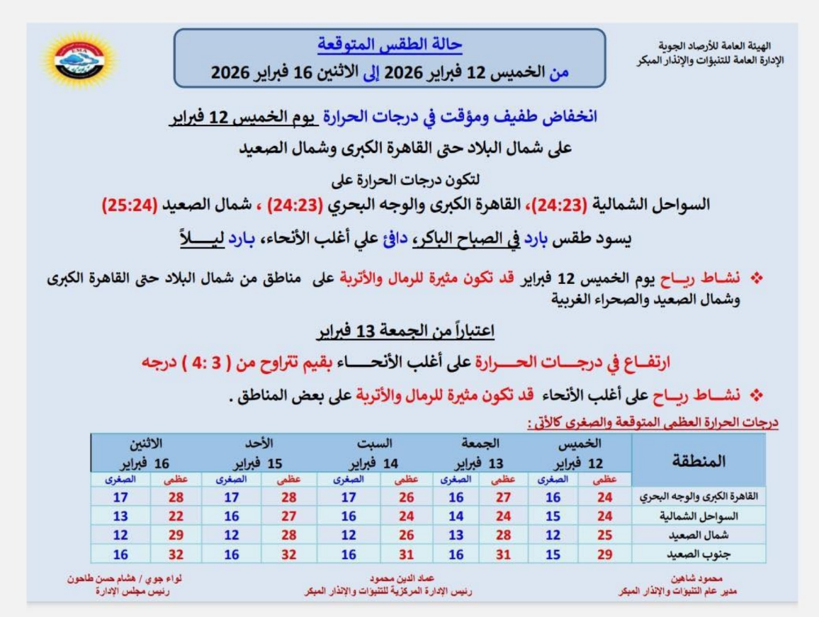 وأشارت توقعات هيئة الأرصاد، إلى أنه اعتبارًا من الجمعة 13 فبراير، تشهد البلاد ارتفاعًا تدريجيًا في درجات الحرارة على أغلب الأنحاء بقيم تتراوح بين 3 و4 درجات مئوية، مع استمرار نشاط الرياح على فترات متقطعة قد تكون مثيرة للرمال والأتربة في بعض المناطق.