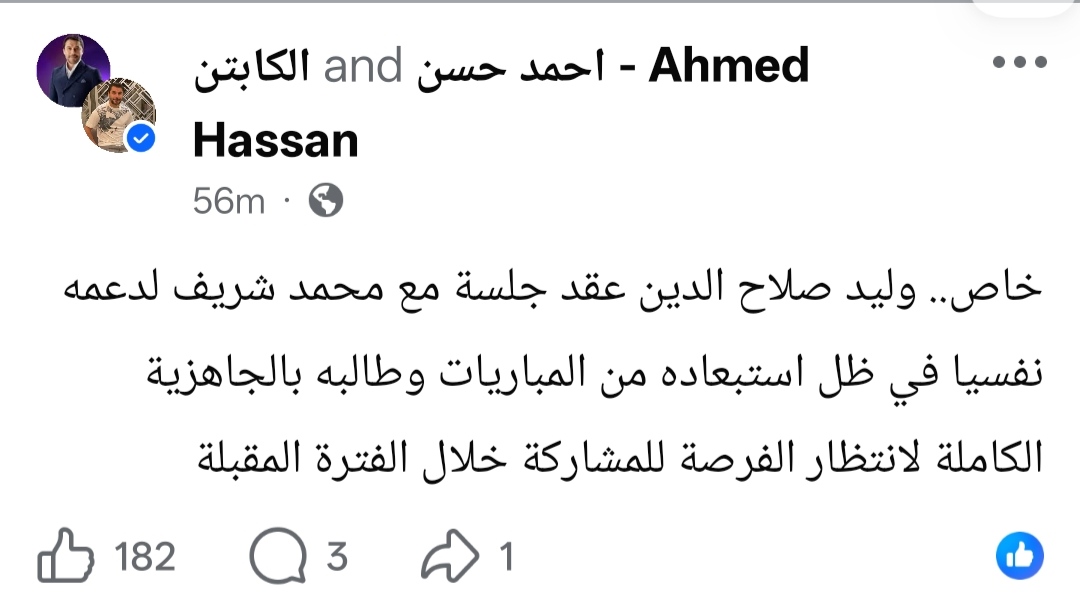 كشف أحمد حسن نجم منتخب مصر السابق كواليس جلسة وليد صلاح الدين مع الاعب محمد شريف عبر حسابه الشخصي بموقع التواصل الإجتماعي فيسبوك.