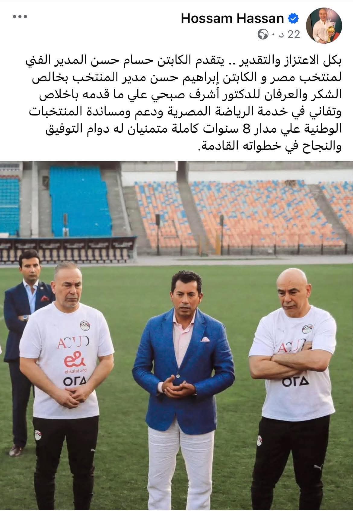 وكتب حسام حسن عبر حسابه على فيسبوك: "خالص الشكر والعرفان للدكتور أشرف صبحي علي ما قدمه بإخلاص وتفانٍ في خدمة الرياضة المصرية ودعم ومساندة المنتخبات الوطنية علي مدار 8 سنوات كاملة مُتمنين له دوام التوفيق والنجاح في خطواته القادمة”.