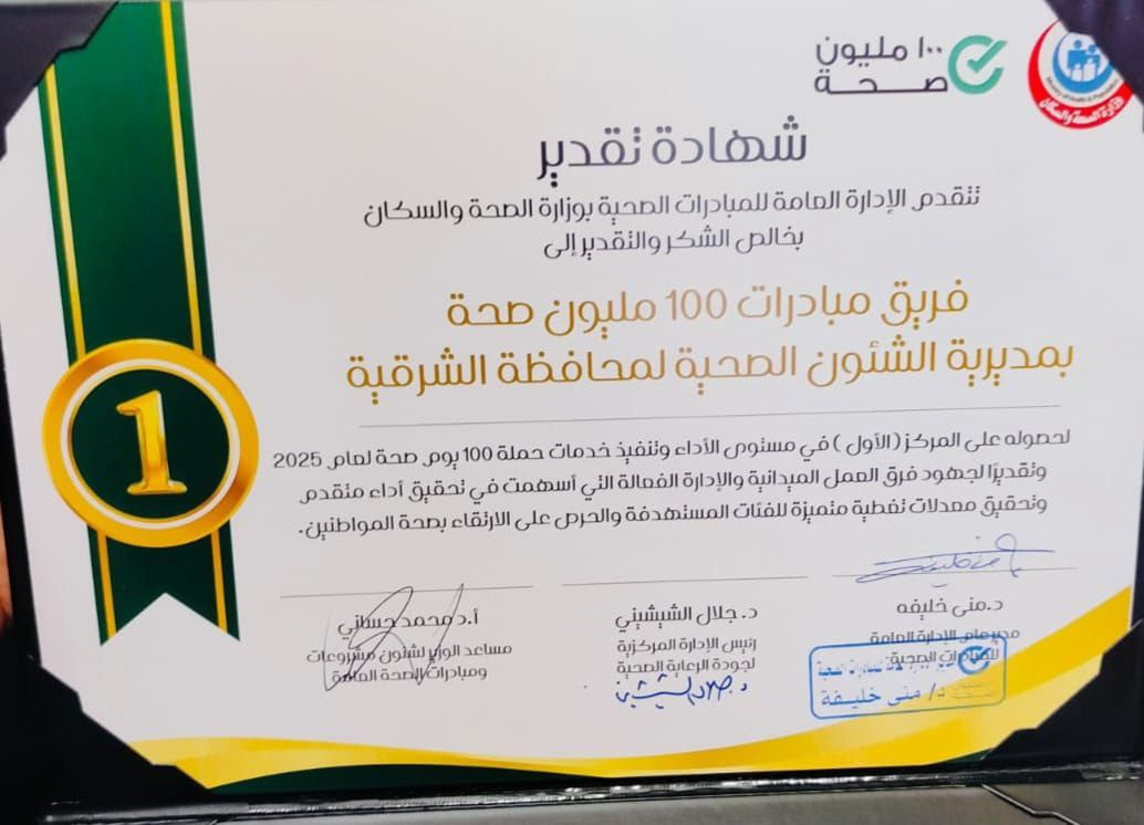 ومن جانبه، أوضح وكيل وزارة الصحة بالشرقية أن حصول مديرية الشؤون الصحية على المركز الأول على مستوى الجمهورية في مستوى الأداء وتنفيذ الخدمات بمبادرة ١٠٠ يوم صحة يعكس الإلتزام الكامل بخطط العمل والمعايير المعتمدة، مؤكداً أن فرق العمل حرصت على تقديم الخدمات الصحية بدقة وكفاءة، لتحقيق أعلى معدلات من الإنجاز، مع ضمان الجودة والوصول الفعلي للمواطنين المستهدفين بالمبادرة من خلال المتابعة الميدانية المستمرة، والتنسيق الكامل بين الإدارات الفنية المختلفة، إلى جانب الدعم المتواصل للفرق الطبية والإشرافية.