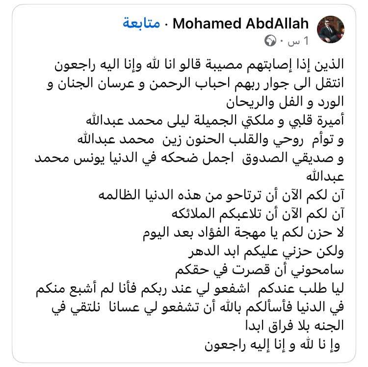في المقابل نعي الاب محمد عبد الله رحيل ابنائه الثلاثة عبر صفحته على موقع التواصل الاجتماعي فس بوك بتدوينه تضمنت عده عبارات موجعه جاء أهمها « رحل أحباب الرحمن وعرسان الجنان ابنائي ليلي وزين ويونس ..نسالكم الدعاء لهم بالرحمه والمغفره ».