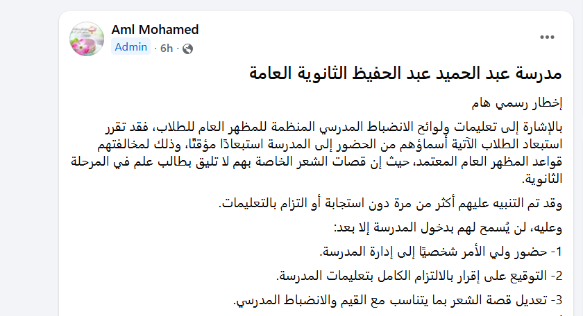وأخيراً أكدت أمل محمد عبد المجيد مديرة مدرسة عبد الحميد عبد الحفيظ الثانوية العامة أن الإلتزام بالمظهر العام والانضباط السلوكي جزء أساسي من العملية التربوية والتعليمية، ولن يتم التهاون في تطبيق اللوائح حفاظًا على هيبة المؤسسة التعليمية وصالح الطلاب.