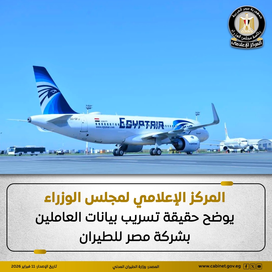 نشر المركز الإعلامي لمجلس الوزراء بيانًا عبر منصاته على مواقع التواصل الاجتماعي، أوضح خلاله حقيقة ما تم تداوله بشأن تسريب بيانات العاملين بشركة مصر للطيران، على خلفية الادعاء بحدوث اختراق سيبراني لأنظمة الموارد البشرية بالشركة.