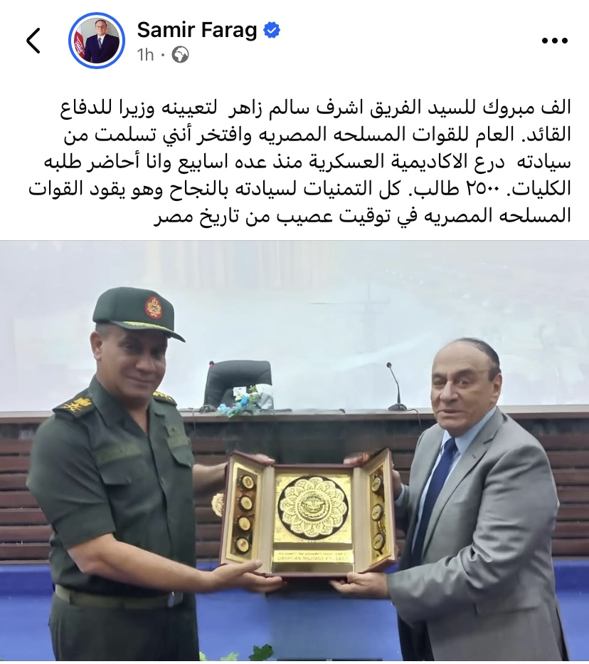 وقال سمير فرج عبر حسابه بموقع التواصل الاجتماعي فيسبوك: "الف مبروك للسيد الفريق اشرف سالم زاهر لتعيينه وزيرا للدفاع القائد العام للقوات المسلحه المصريه وافتخر أنني تسلمت من سيادته درع الاكاديمية العسكرية منذ عده اسابيع وانا أحاضر طلبه الكليات. ٢٥٠٠ طالب. كل التمنيات لسيادته بالنجاح وهو يقود القوات المسلحه المصريه في توقيت عصيب من تاريخ مصر".