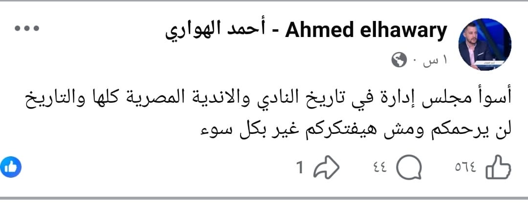 وكتب الهواري عبر حسابه على “فيسبوك”: “أسوأ مجلس إدارة في تاريخ النادي والأندية المصرية كلها.. التاريخ لن يرحمكم.. ومش هيفتكركم غير بكل سوء”.