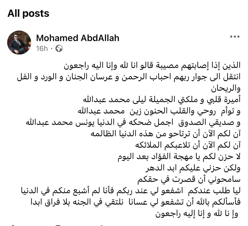 وأعلن الأب محمد عبدالله عبر حسابه الشخصى فيسبوك خبر وفاة أبنائه الثلاثة وعلق قائلًا: «الذين إذا إصابتهم مُصيبة قالو إنا لله وإنا إليه راجعون»