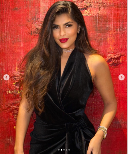 تألقت زوجة ماجد المصري في الصور بإطلالة ملفتة، حيث ارتدت فستان قصير يصل أعلى الركبة وذا أكمام مكشوفة و اتسم التصميم باللون الأسود الذي كشف عن قوامها المثالي.