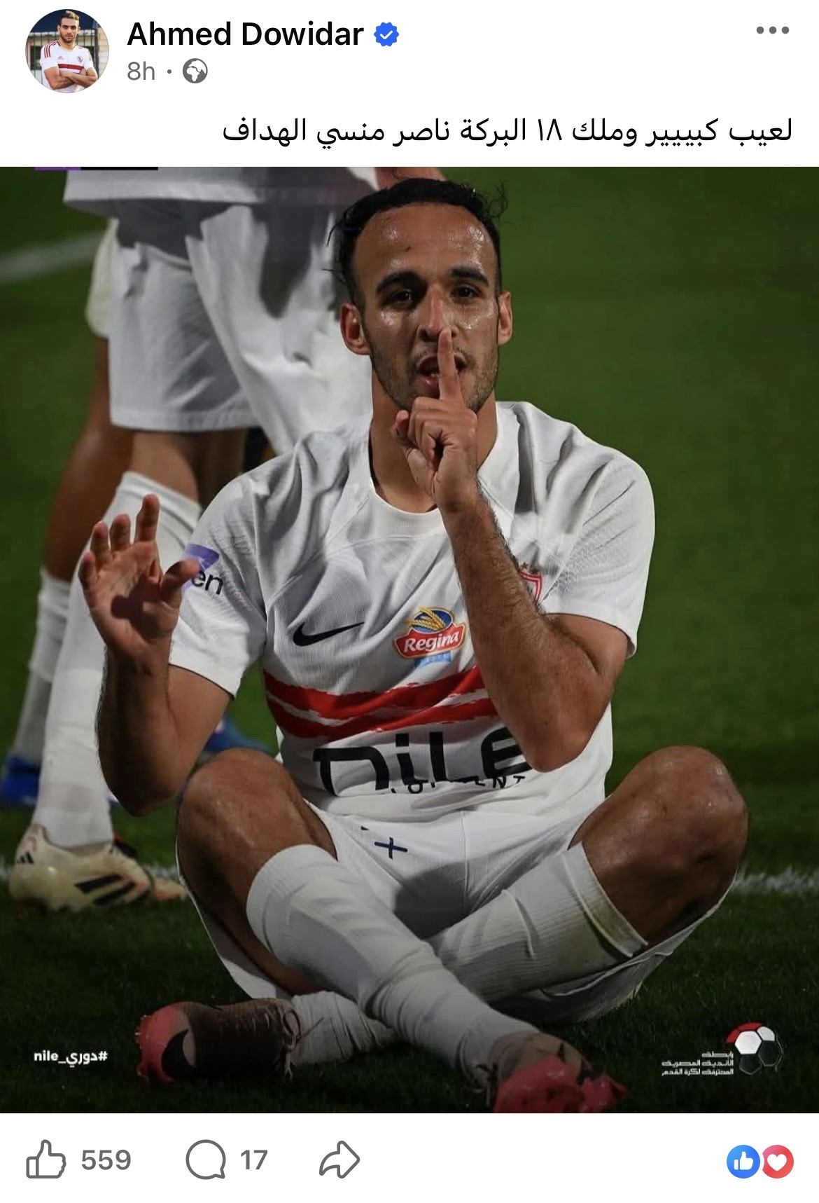 وكتب دويدار عبر حسابه على فيسبوك: “لعيب كبييير وملك ١٨ البركة ناصر منسي الهداف”.