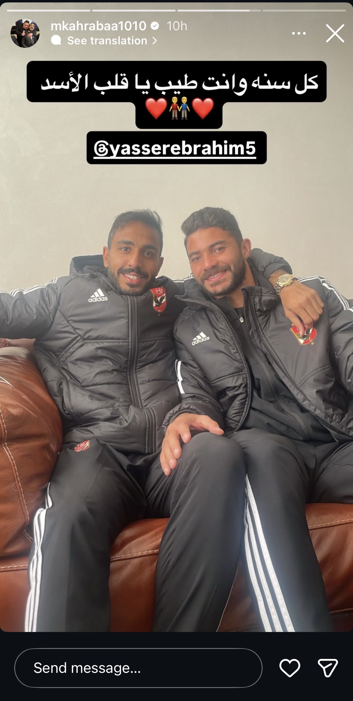 وحرص كهربا على تهنئة ياسر ابراهيم بعيد ميلاده، وشارك صورة تجمعهم، وعلق: “كل سنة وانت طيب يا قلب الاسد”.