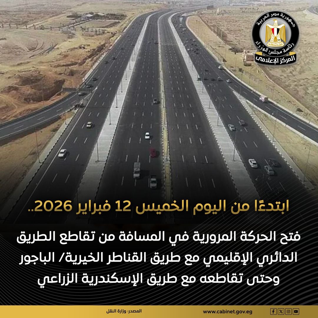 أعلنت وزارة النقل، أنه تزامنًا مع قرب بداية شهر رمضان المبارك وتيسيرًا على مستخدمي الطريق، تقرر فتح المسافة من تقاطع الطريق الدائري الإقليمي مع طريق القناطر الخيرية/ الباجور وحتى تقاطع الطريق الإقليمي مع طريق الاسكندرية الزراعي أمام حركة المرور ابتداءًا من اليوم الخميس الموافق 12 فبراير 2026.