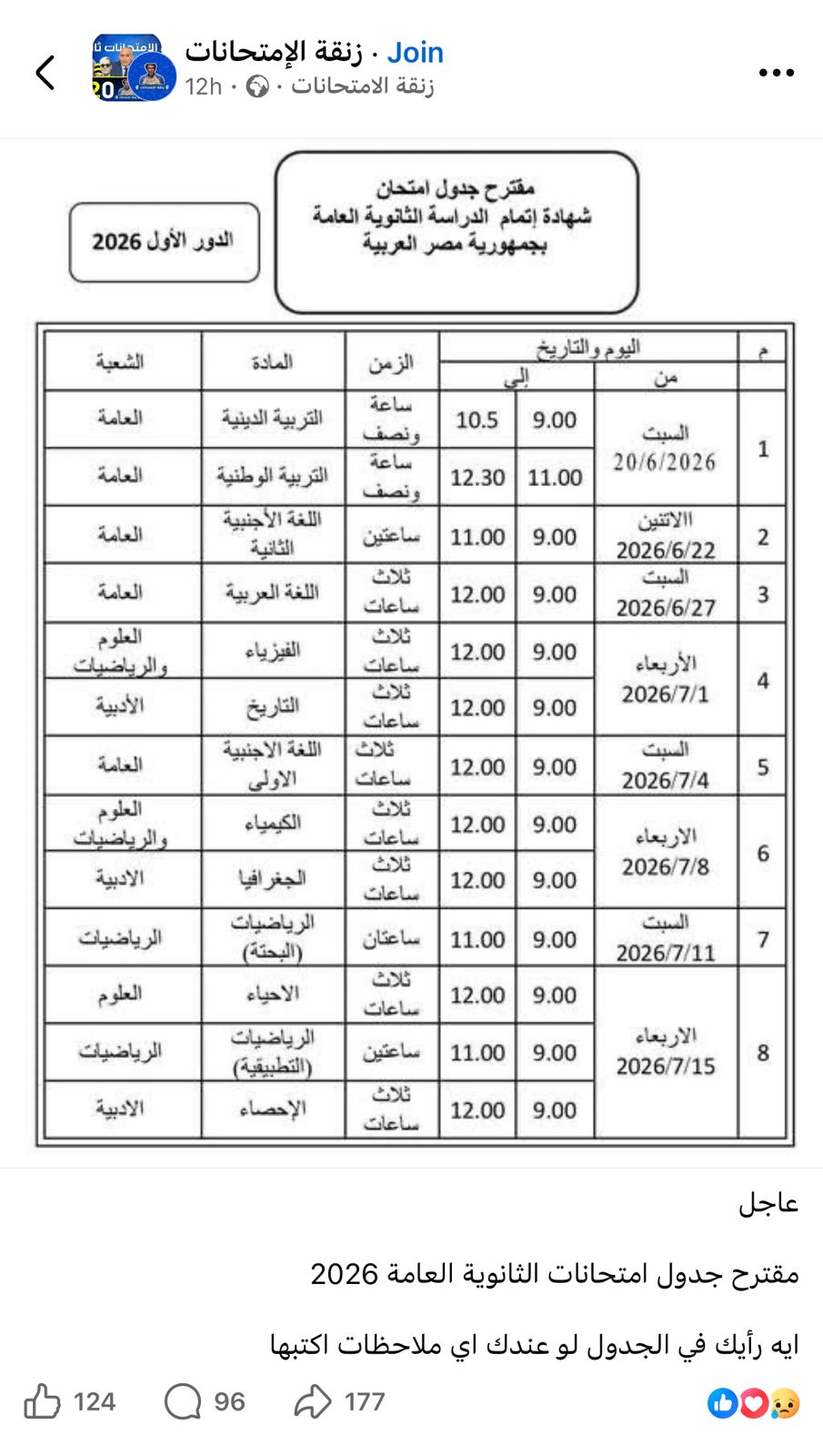 جدول امتحانات الثانوية العامة 2026 .. انتشرت على موقع التواصل الإجتماعي فيس بوك ، صورة له يزعم ناشروها انها عبارة عن “مقترح” للعرض على الطلاب