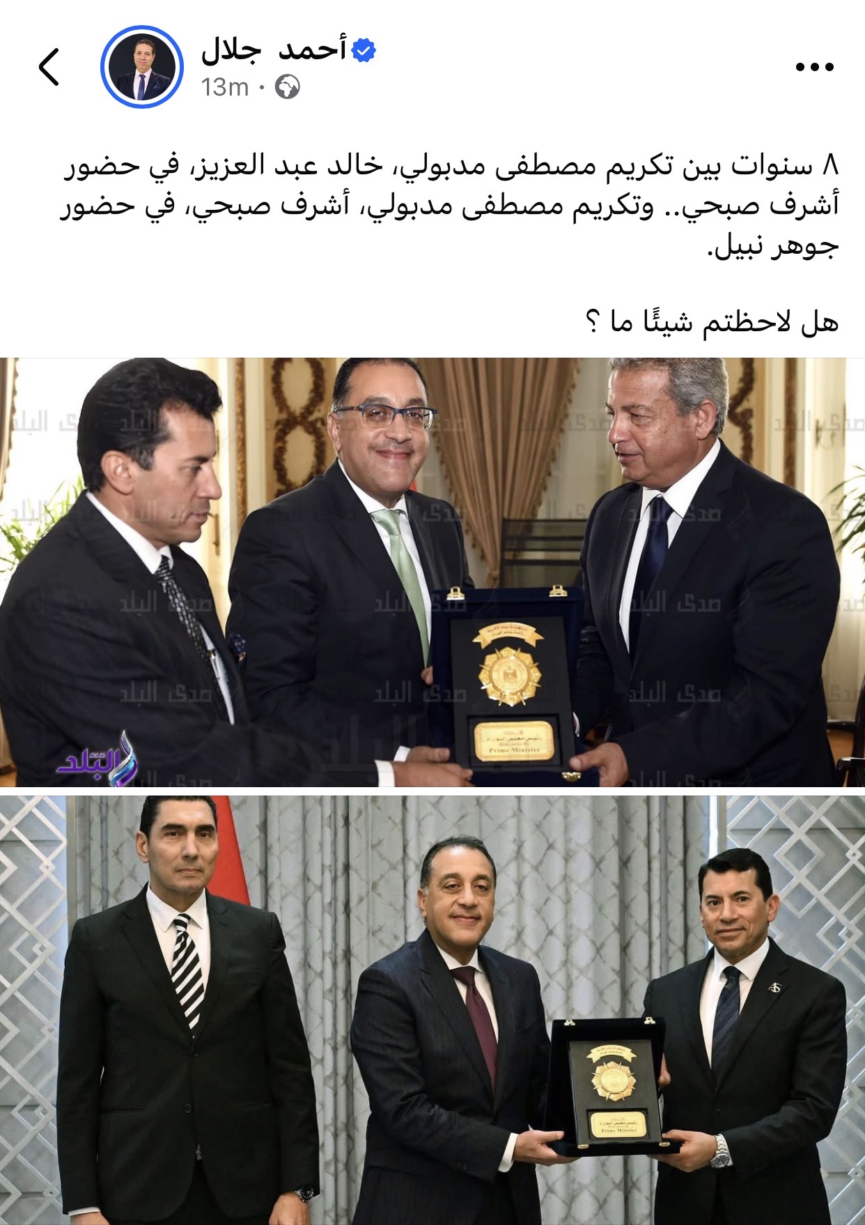وأوضح جلال أن الصورة الأولى تعود إلى تكريم مدبولي بحضور الدكتور أشرف صبحي، بينما توثق الصورة الثانية تكريمه مجددًا بعد مرور 8 سنوات، في حضور الوزير نفسه، معلقًا: "هل لاحظتم شيئًا ما؟".