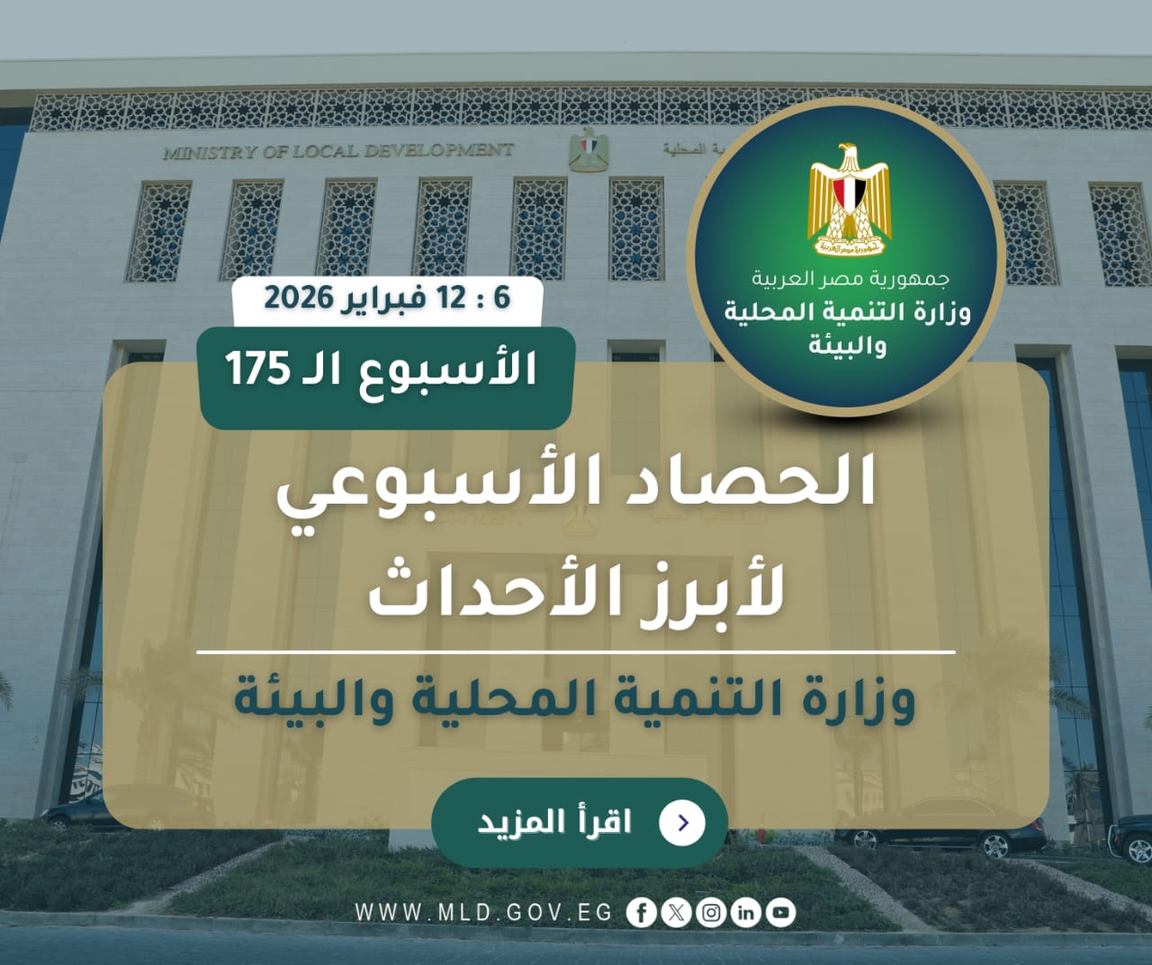 أصدر المركز الإعلامي لوزارة التنمية المحلية والبيئة "الانفوجراف الأسبوعي" في نسخته الـ 175 حول أبرز أنشطة وفعاليات الوزارة بقيادة الدكتورة منال عوض وزيرة التنمية المحلية والبيئة، حيث تضمن مجموعة من الفعاليات والاجتماعات ومتابعة المشروعات التنموية المهمة خلال الفترة (6 : 12 فبراير 2026).