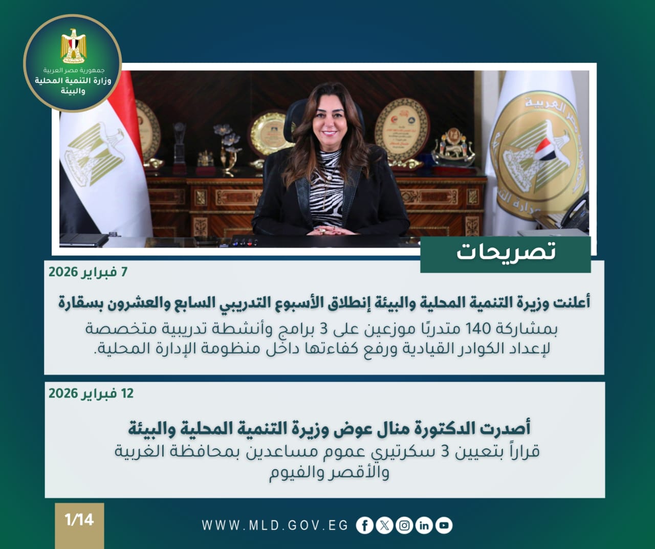 أعلنت الدكتورة منال عوض وزيرة التنمية المحلية والبيئة عن إنطلاق برامج الأسبوع التدريبي رقم (27) ضمن الخطة التدريبية لمركز سقارة للتدريب للعام 2025 / 2026، مشيرًة الي أن الأسبوع التدريبي الجاري يتضمن تنفيذ 3 برامج تدريبية بإجمالي حضور 140 متدربًا من مختلف محافظات الجمهورية ، خلال الفترة من 8 / 2 / 2026 وحتى 11 / 2 / 2026.