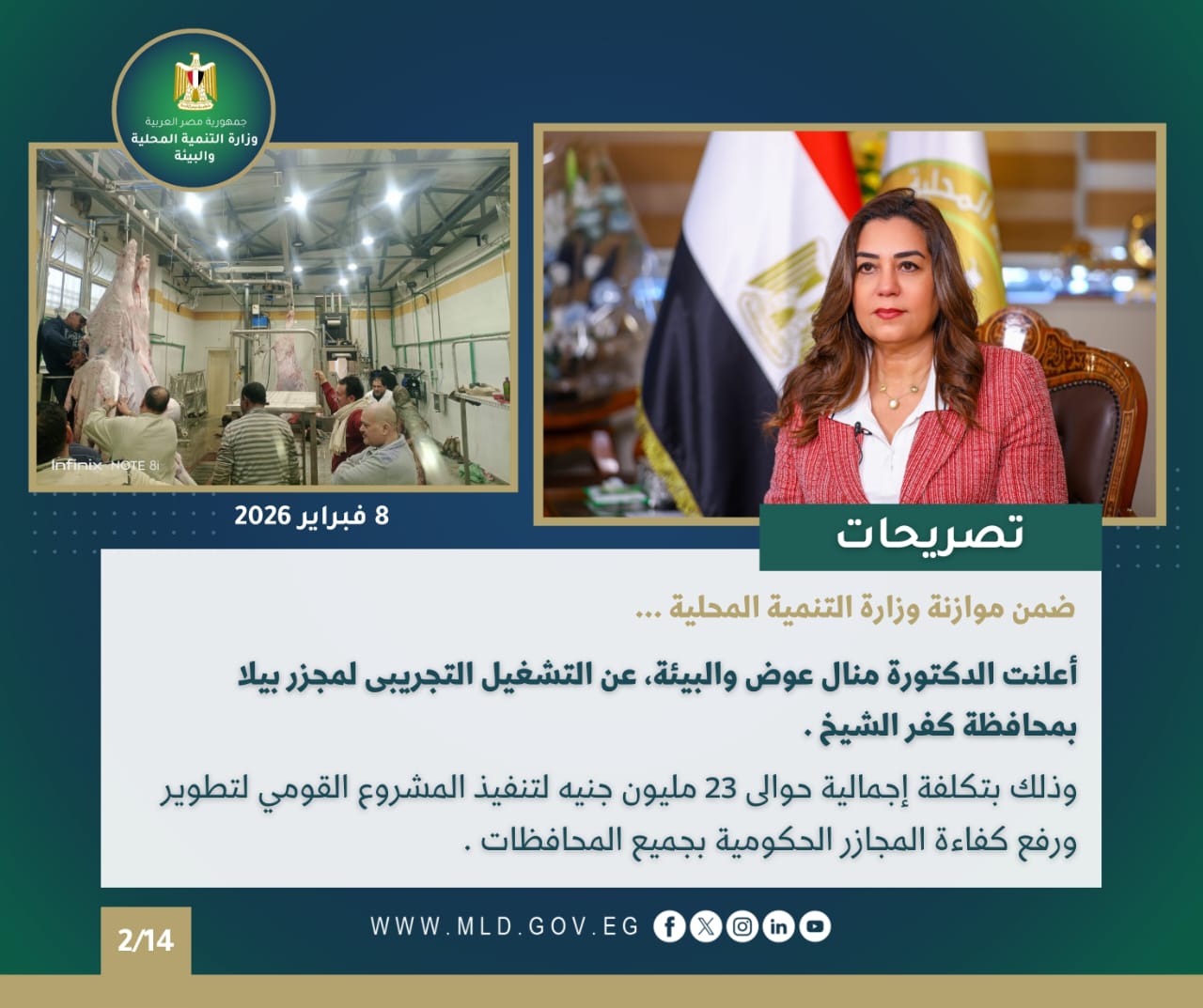 أعلنت وزيرة التنمية المحلية والبيئة، عن التشغيل التجريبى لمجزر بيلا بمحافظة كفر الشيخ وذلك بتكلفة إجمالية حوالى 23 مليون جنيه ضمن موازنة وزارة التنمية المحلية لتنفيذ المشروع القومي لتطوير ورفع كفاءة المجازر الحكومية بجميع المحافظات .