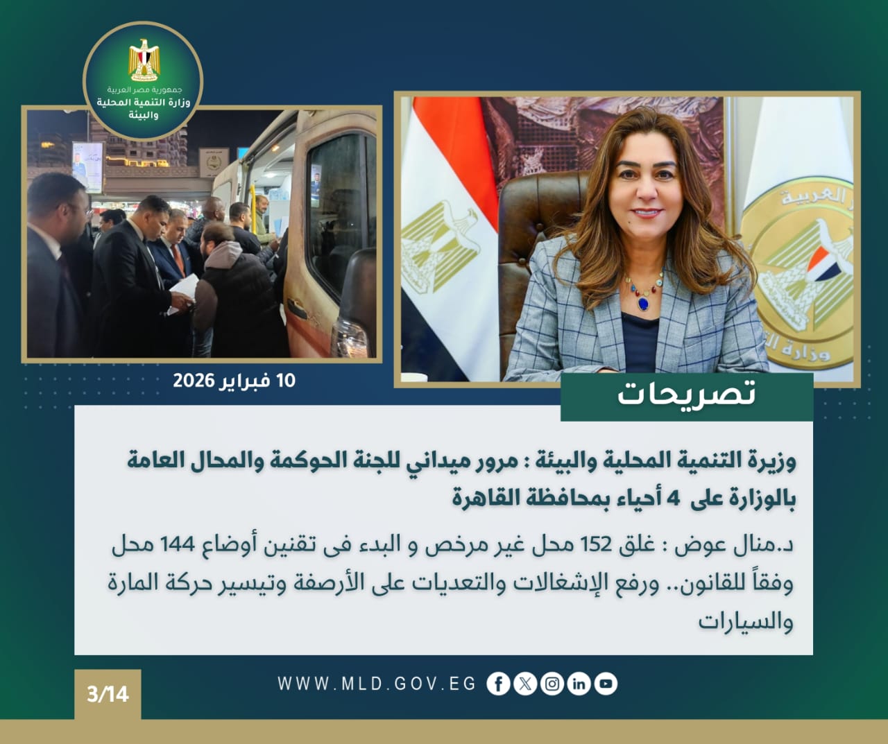 تلقت الدكتورة منال عوض وزيرة التنمية المحلية والبيئة ، تقريراً مشتركاً من لجنة المحال العامة والإدارة العامة للمراجعة الداخلية والحوكمة بالوزارة حول نتائج المرور الميداني الذي نفذته فرق الوزارة الأسبوع الأول من شهر فبراير الجاري على 4 أحياء بالقاهرة هي شرق مدينة نصر وغرب مدينة نصر وغرب القاهرة و الزاوية الحمراء وذلك صباحاً ومساءً لمراجعة تراخيص المحال العامة وعدد من الملفات التى تمس حياة المواطنين يومياً والوقوف على مستوى الأداء وتحقيق الإنضباط وفرض سيادة القانون والتصدي لأي مظاهر سلبية.