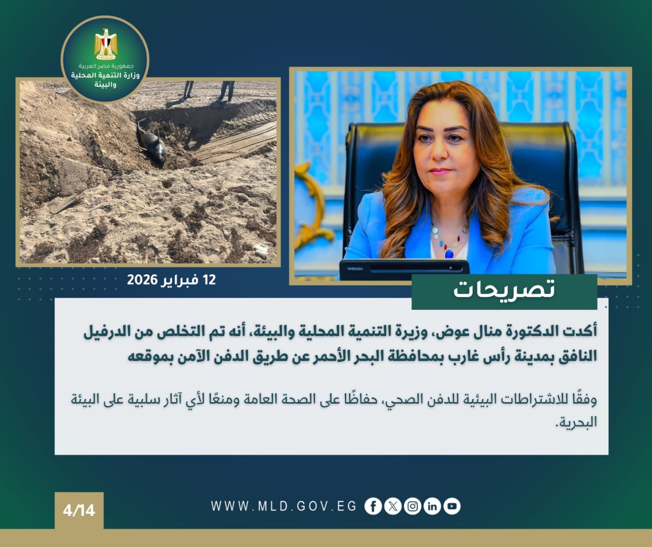 كما أكدت وزيرة التنمية المحلية والبيئة، أنه تم التخلص من الدرفيل النافق بمدينة رأس غارب بمحافظة البحر الأحمر عن طريق الدفن الآمن بموقعه ، وفقًا للاشتراطات البيئية للدفن الصحي، حفاظًا على الصحة العامة ومنعًا لأي آثار سلبية على البيئة البحرية.