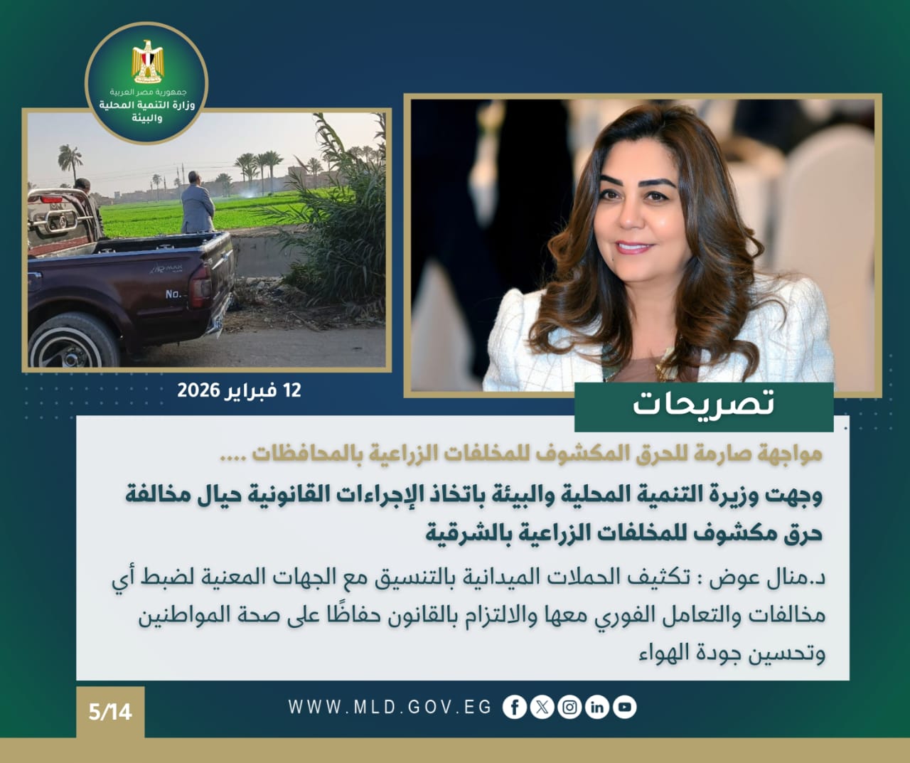 وفي إطار تنفيذ توجيهات الدكتورة منال عوض وزيرة التنمية المحلية والبيئة بمواجهة ظاهرة الحرق المكشوف للمخلفات الزراعية، للحد من الانبعاثات ونوبات تلوث الهواء الحادة بالمحافظات ، قام الفرع الإقليمي لجهاز شؤون البيئة بمحافظة الشرقية بالإشتراك مع الإدارة الزراعية بمركز منيا القمح، بإتخاذ الإجراءات اللازمة العاجلة حيال حرق مخلفات زراعية تم رصدها بقرية الصنافين البحرية بمركز منيا القمح بالشرقية.