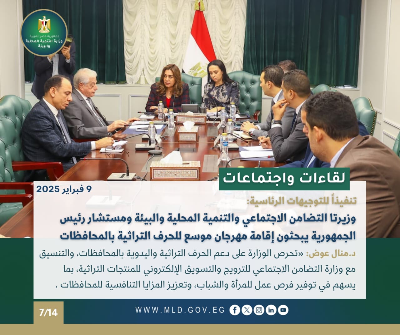 اجتمعت الدكتورة مايا مرسي وزيرة التضامن الاجتماعي والدكتورة منال عوض وزيرة التنمية المحلية والبيئة، واللواء خالد فودة مستشار السيد رئيس الجمهورية للتنمية المحلية، وناقش الاجتماع تنفيذ التوجيهات الرئاسية بإقامة مهرجان عالمي على أرض مصر للحرف التراثية، مع شموله بعدد من الفعاليات الثقافية والفنية والترفيهية، كما تم مناقشة عدد من المقترحات لخروج المهرجان بالشكل الأمثل.