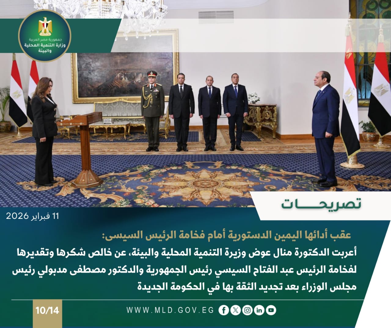 أعربت الدكتورة منال عوض وزيرة التنمية المحلية والبيئة، عن خالص شكرها وتقديرها لفخامة الرئيس عبد الفتاح السيسي رئيس الجمهورية والدكتور مصطفى مدبولي رئيس مجلس الوزراء بعد تجديد الثقة بها في الحكومة الجديدة وذلك عفب أدائها اليمين الدستورية.