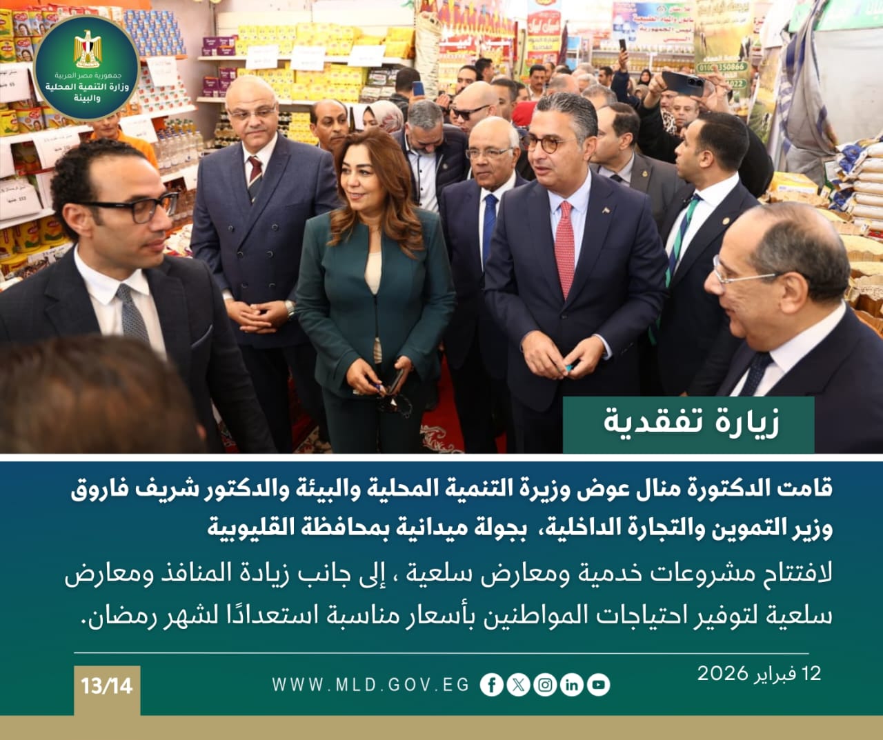 وقامت الدكتورة منال عوض وزيرة التنمية المحلية والبيئة، والدكتور شريف فاروق وزير التموين والتجارة الداخلية، بجولة ميدانية بمحافظة القليوبية لافتتاح مشروعات خدمية ومعارض سلعية ، حيث كان في استقبالهما المهندس أيمن عطية محافظ القليوبية، وذلك في إطار توجيهات القيادة السياسية بالتوسع في إقامة المشروعات الخدمية وتعزيز منظومة الأمن الغذائي، إلى جانب زيادة المنافذ والمعارض السلعية لتوفير احتياجات المواطنين بأسعار مناسبة.