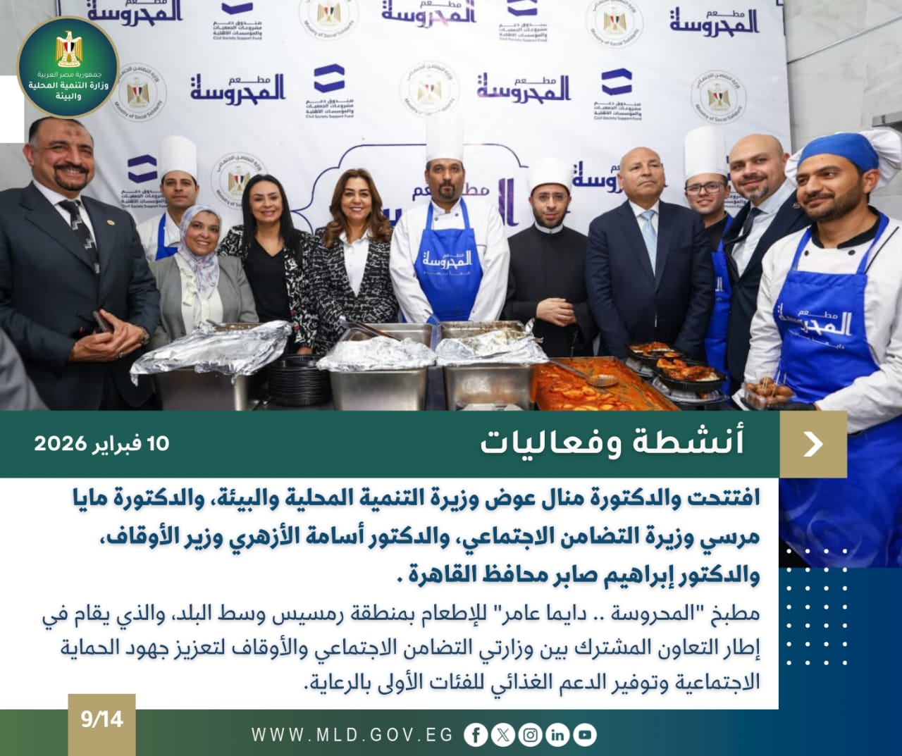 كما افتتحت الدكتورة منال عوض وزيرة التنمية المحلية والبيئة، والدكتورة مايا مرسي وزيرة التضامن الاجتماعي، والدكتور أسامة الأزهري وزير الأوقاف، والدكتور إبراهيم صابر محافظ القاهرة، مطبخ "المحروسة .. دايما عامر" للإطعام بمنطقة رمسيس وسط البلد، والذي يقام في إطار التعاون المشترك بين وزارتي التضامن الاجتماعي والأوقاف لتعزيز جهود الحماية الاجتماعية وتوفير الدعم الغذائي للفئات الأولى بالرعاية.