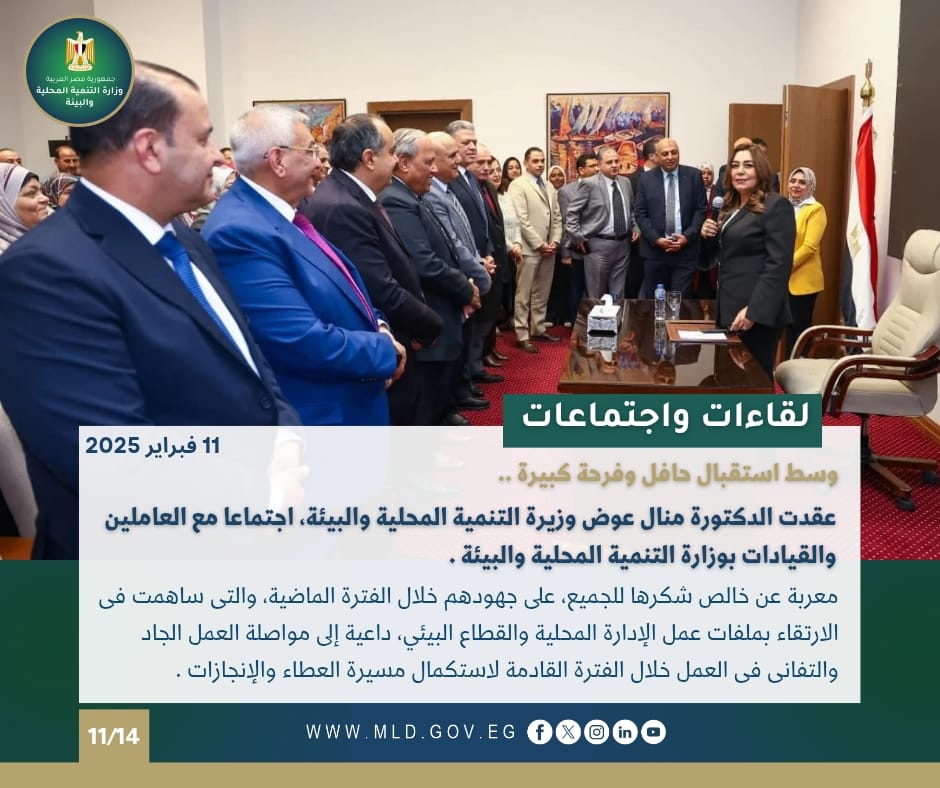 ووسط استقبال حافل وفرحة كبيرة .. عقدت الدكتورة منال عوض والبيئة، اجتماعا مع العاملين والقيادات بوزارة التنمية المحلية والبيئة، معربة عن خالص شكرها للجميع، على جهودهم خلال الفترة الماضية، والتى ساهمت فى الارتقاء بملفات عمل الإدارة المحلية والقطاع البيئي، داعية إلى مواصلة العمل الجاد والتفانى فى العمل خلال الفترة القادمة لاستكمال مسيرة العطاء والإنجازات بما يساهم فى تحقيق نقلة نوعية فى الخدمات المقدمة للمواطنين .