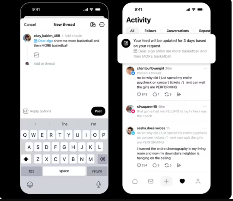 أعلنت شركة ميتا Meta، عن إطلاق ميزة جديدة في تطبيق ثريدز Threads تحمل اسم “Dear Algo”، تتيح للمستخدمين تحكما أكبر في المحتوى الذي يظهر لهم ضمن الصفحة الرئيسية.