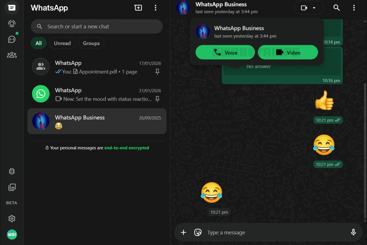 حاليا، يقتصر الوصول إلى ميزة المكالمات على مستخدمي بيتا فقط، لكن واتساب يخطط لتوسيعها تدريجيا، ومن المتوقع أن تصبح المكالمات الصوتية والفيديو متاحة لمزيد من المستخدمين خارج النسخة التجريبية خلال الأسابيع القادمة.