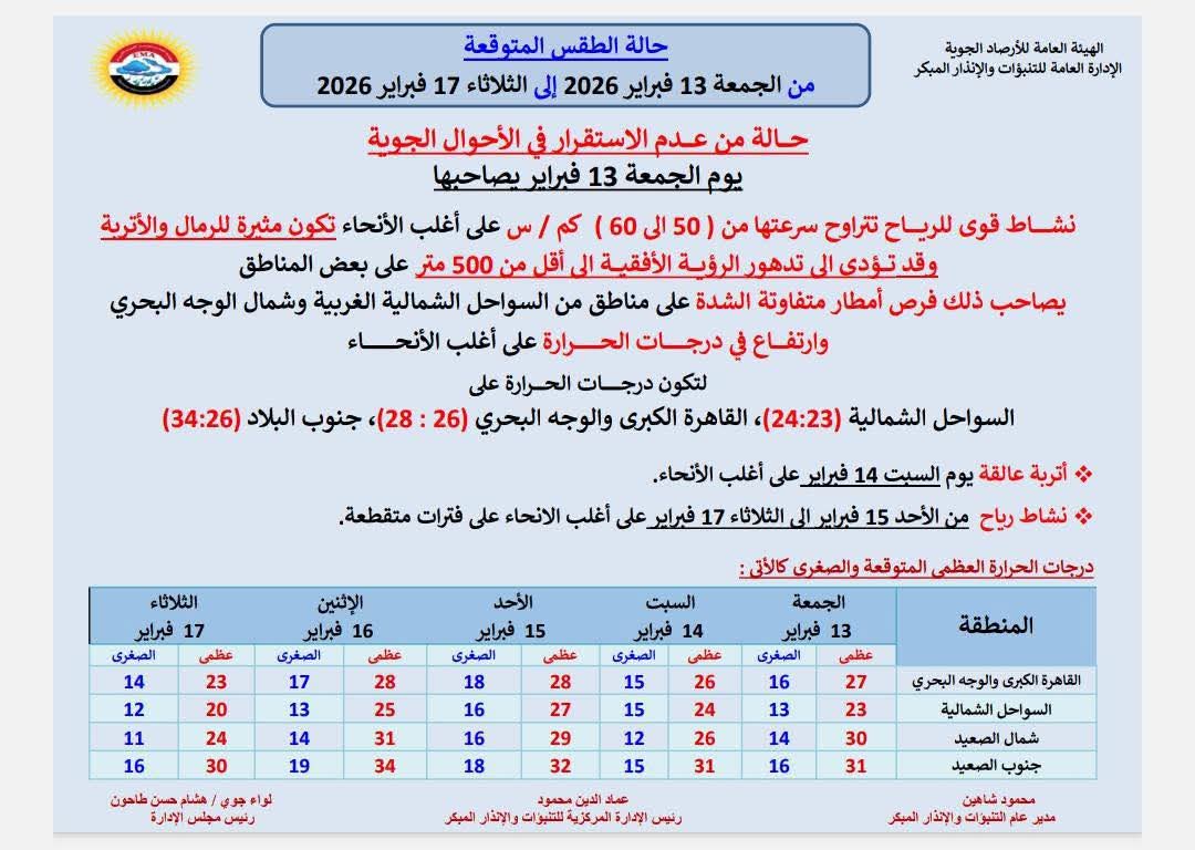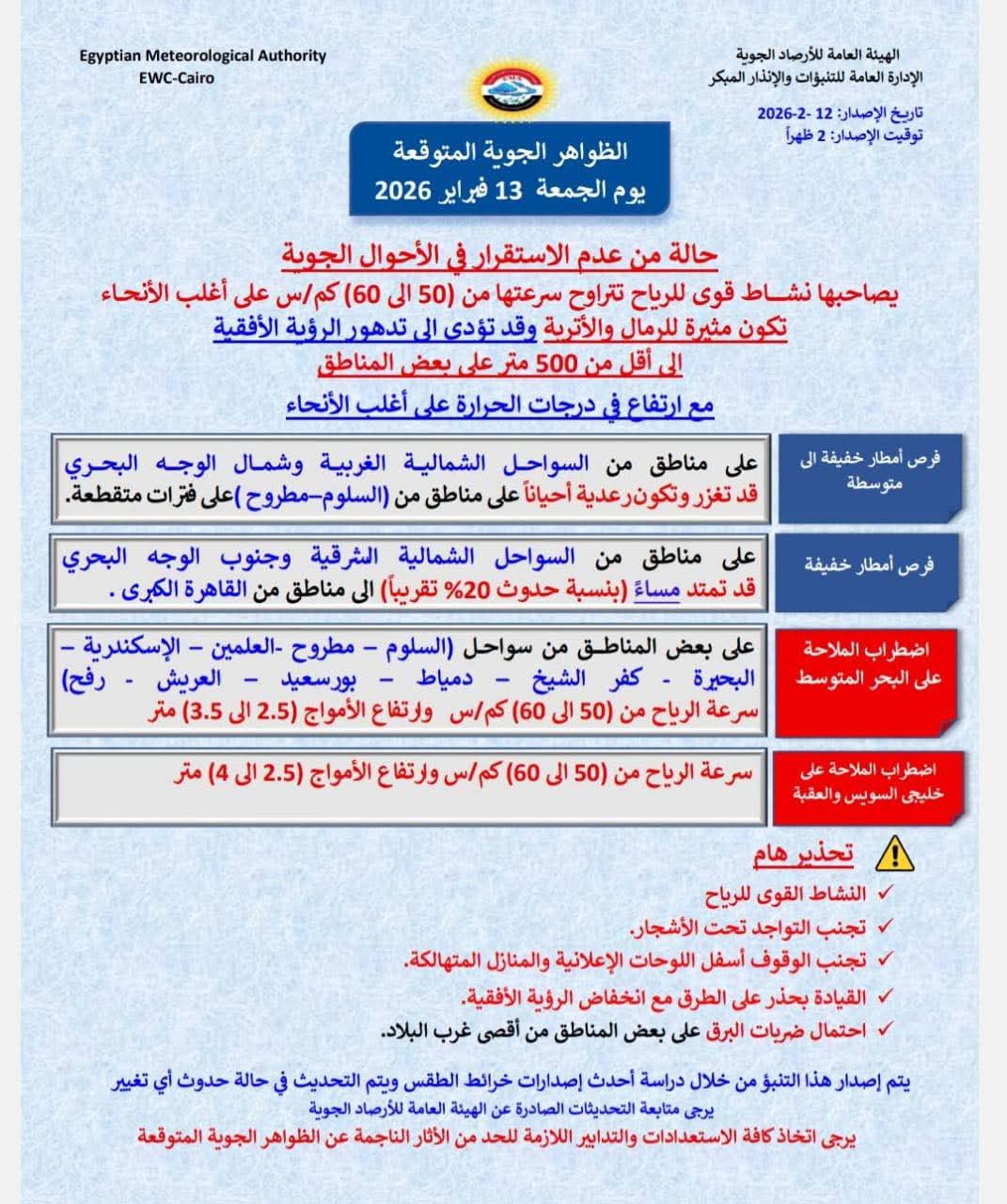 تتأثر البلاد بوجود منخفض سطحي متعمق يصاحبه نشاط للرياح الجنوبية الغربية والغربية القوية التي تعمل على إثارة الرمال والأتربة وتدهور الرؤية الأفقية إلى أقل من 500 متر، ومن المتوقع ان تصل سرعات الرياح من ( 60:50) كم /س، مع اضطراب في حركة الملاحة البحرية على البحر المتوسط وخليجي السويس والعقبة.