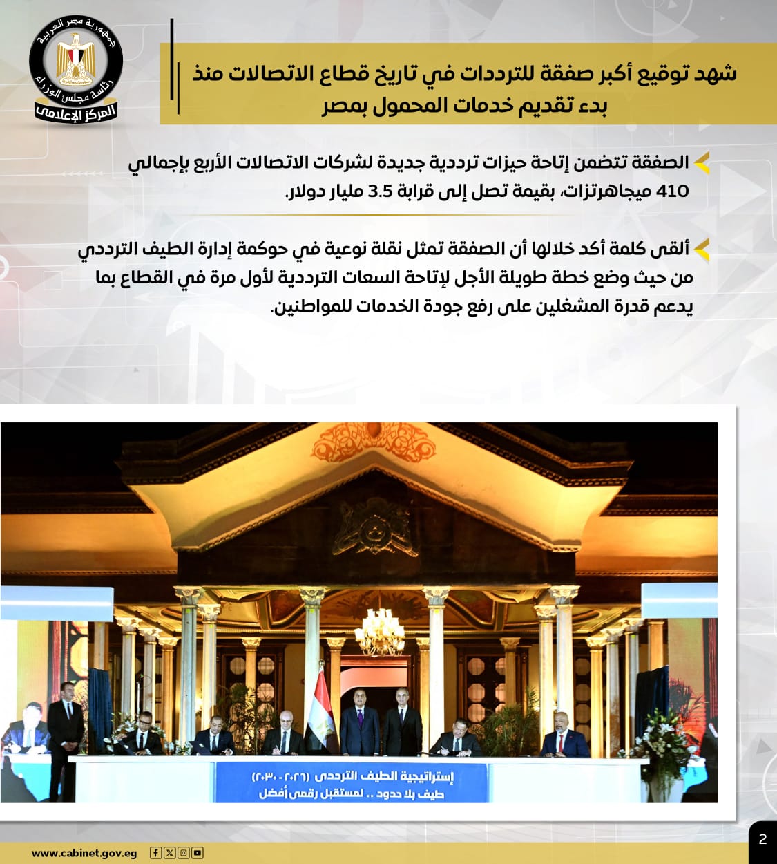 كما شهد، توقيع أكبر صفقة للترددات في تاريخ قطاع الاتصالات منذ بدء تقديم خدمات المحمول بمصر، والتي تضمنت إتاحة حيزات ترددية جديدة لشركات الاتصالات الأربع بإجمالي ٤١٠ ميجاهرتزات، بقيمة تصل إلى قرابة ٣.٥ مليار دولار.