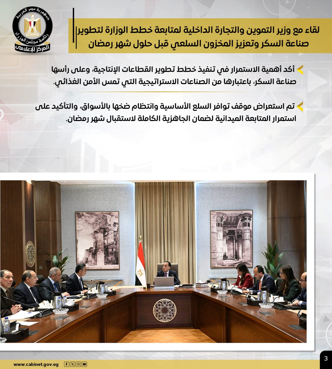 وشملت الأنشطة، لقاء مع وزير التموين والتجارة الداخلية، لمتابعة خطط الوزارة لتطوير صناعة السكر وتعزيز المخزون السلعي قبل حلول شهر رمضان، مؤكدًا أهمية الاستمرار في تنفيذ خطط تطوير القطاعات الإنتاجية، وعلى رأسها صناعة السكر، وتم خلال اللقاء استعراض موقف توافر السلع الأساسية وانتظام ضخها بالأسواق استعدادًا لاستقبال شهر رمضان.