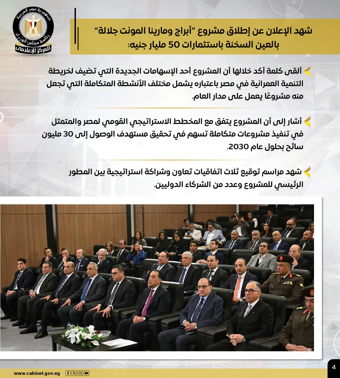 كما شهد رئيس الوزراء الإعلان عن إطلاق مشروع "أبراج ومارينا المونت جلالة" بالعين السخنة باستثمارات 50 مليار جنيه، مؤكدًا أن المشروع أحد الإسهامات الجديدة التي تضيف لخريطة التنمية العمرانية في مصر، مُشيرًا إلى أن المشروع يتفق مع المخطط الاستراتيجي القومي لمصر والمتمثل في تنفيذ مشروعات متكاملة تسهم في تحقيق مستهدف الوصول إلى 30 مليون سائح بحلول عام 2030.