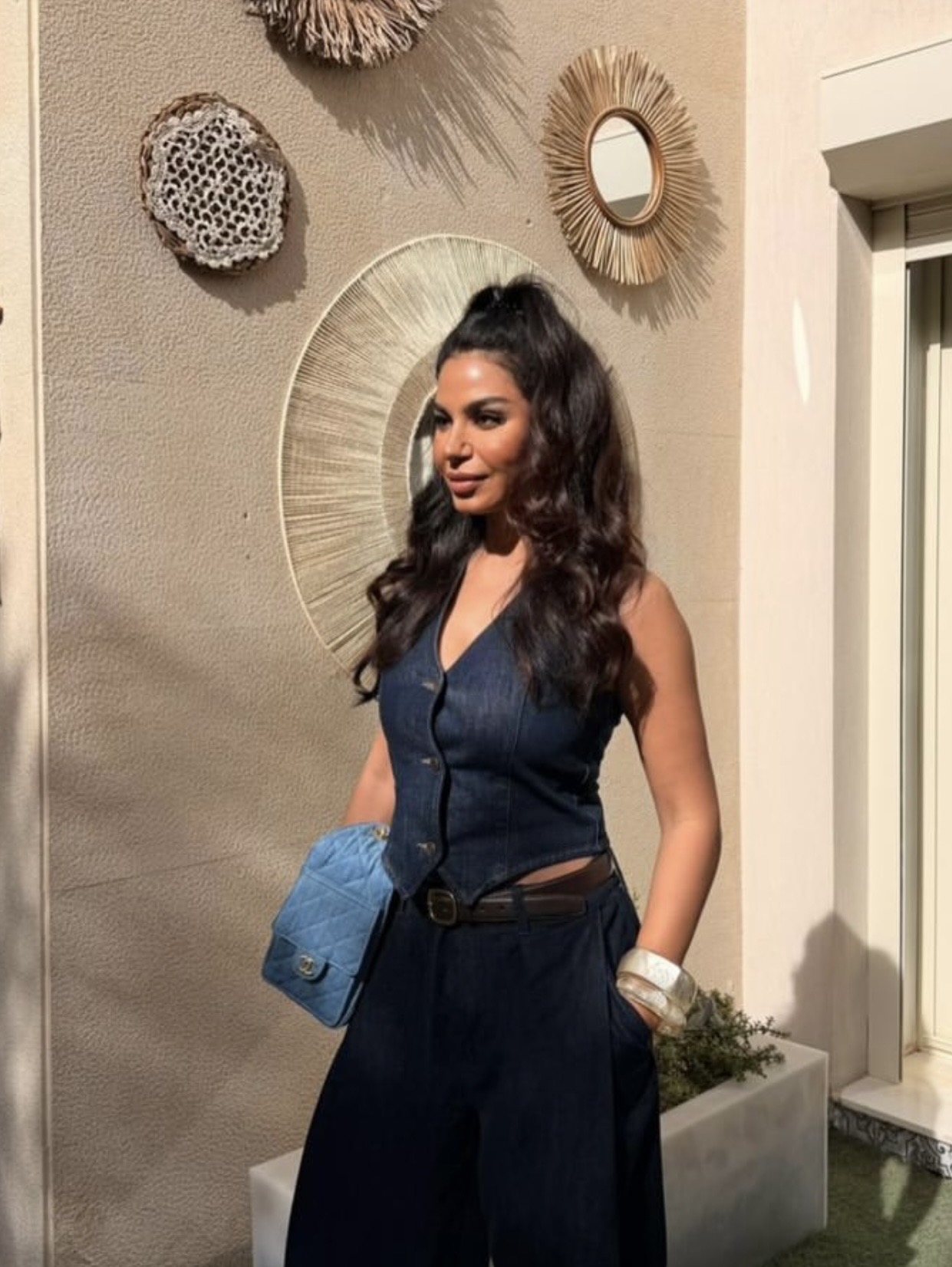 وظهرت نسرين مرتدية سوت من الجينز بتصميم كلاسيكي أنيق، أبرز رشاقتها، مع قصة شعر منسدل بتسريحة طبيعية زادت من جاذبية الإطلالة. واعتمدت مكياجًا هادئًا بألوان ترابية، ما أضفى لمسة من النعومة والرقي على مظهرها.