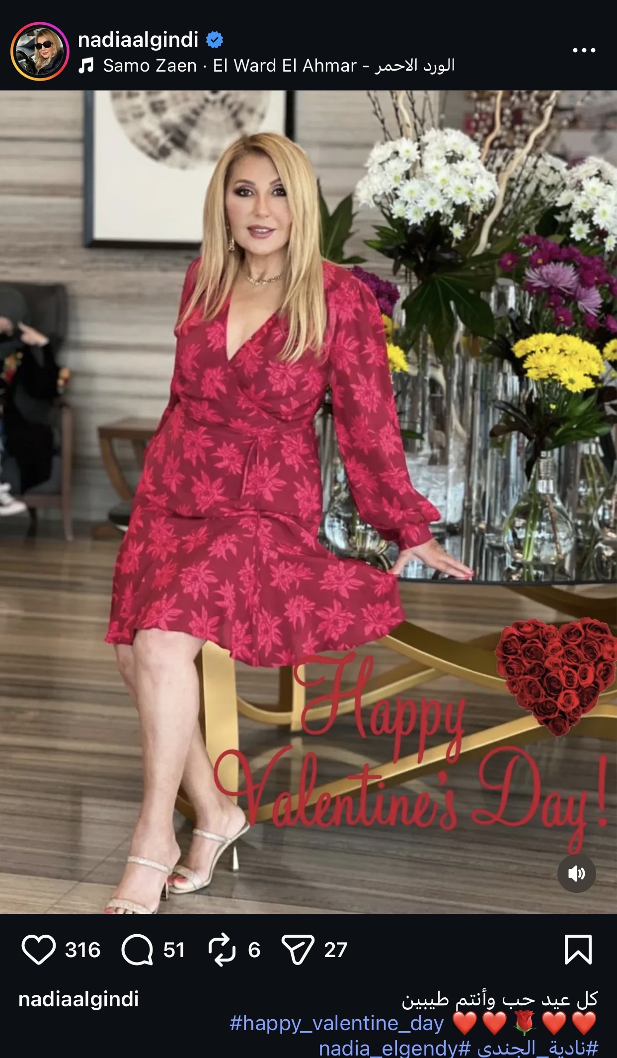 شاركت الفنانة نادية الجندي متابعيها عبر حسابها الشخصي بموقع إنستجرام صورة جديدة لها بفستان أحمر قصير، موجهة لهم تهنئة بمناسبة عيد الحب، بعبارة بسيطة قائلة: “كل عيد حب وأنتم طيبين".