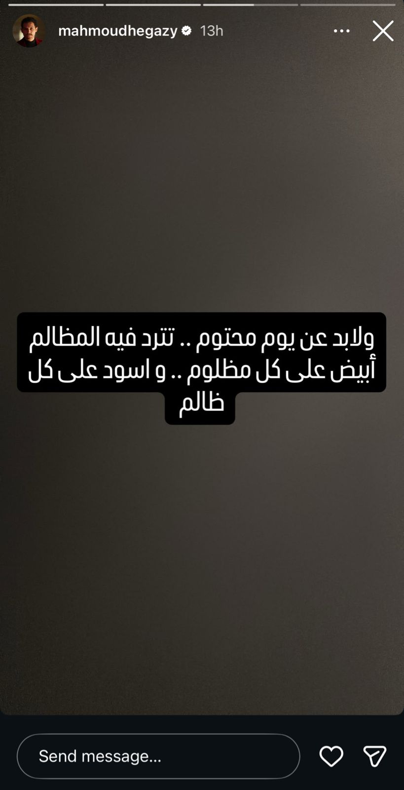 وكتب محمود حجازي عبر خاصية الاستوري: “ولابد عن يوم محتوم تترد فيه المظالم أبيض على كل مظلوم وأسود على كل ظالم”.