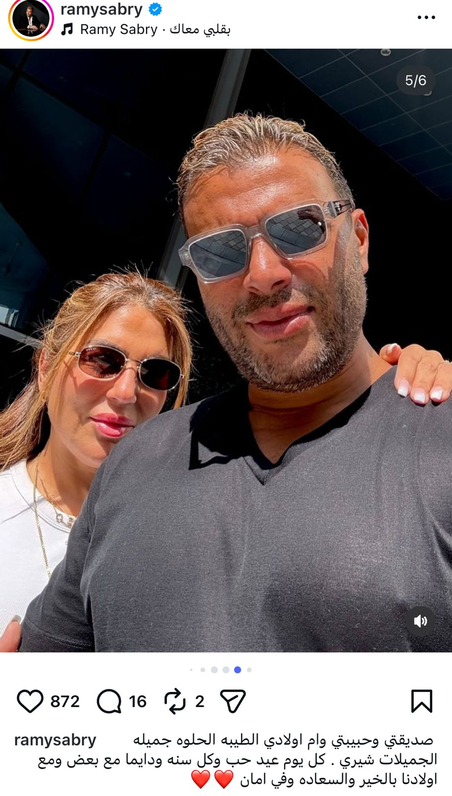 وكتب رامي صبري عبر انستجرام: “صديقتي وحبيبتي وام اولادي الطيبه الحلوه جميلة الجميلات شيري، كل يوم عيد حب وكل سنه ودايما مع بعض ومع اولادنا بالخير والسعاده وفي امان”.