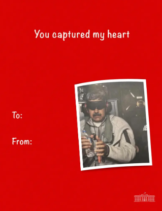 تقول البطاقة الأولى: "لقد أسرت قلبي"، وتتضمن صورة للرئيس الفنزويلي المعتقل نيكولاس مادورو وهو يُنقل جوًا من فنزويلا مكبلًا ومعصوب العينين بعد عملية "العزم المطلق".