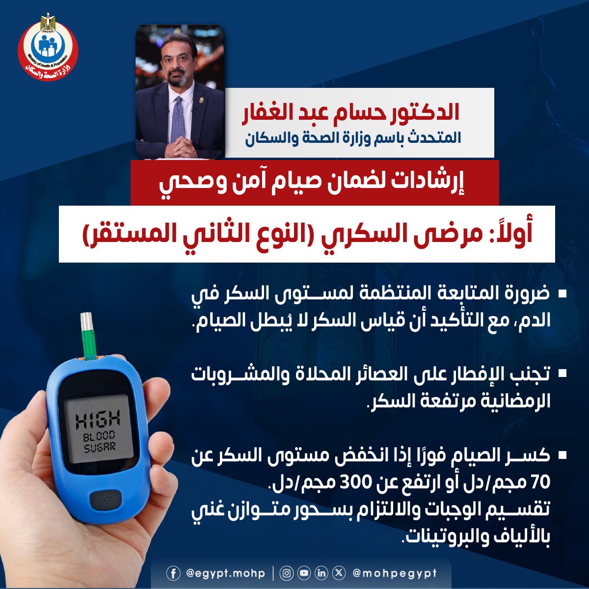 وقال عبدالغفار ، هناك مجموعة من الإرشادات لرمضي السكر ، لضمان صيام آمن وصحي والتي تتمثل في التالي :-