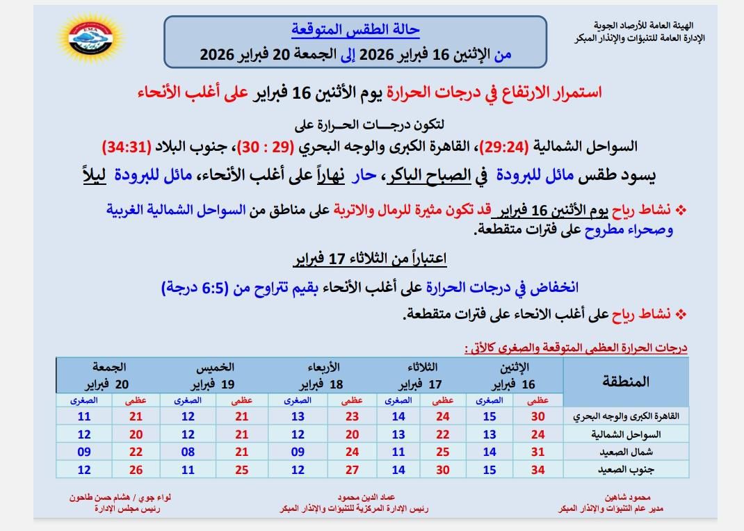 أعلنت الهيئة العامة للأرصاد الجوية، عن حالة الطقس المتوقعة يوم الإثنين 16 فبراير إلى الجمعة 20 فبراير على أغلب الأنحاء لتكون درجات الحرارة على السواحل الشمالية 24: 29 درجة، وتسجل القاهرة الكبرى والوجه البحري 29:30، وجنوب البلاد 31:34 درجة.