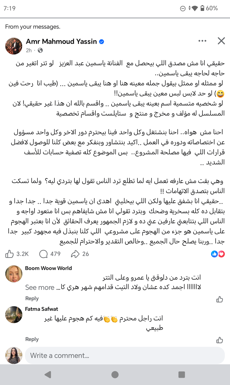 ..حقيقي انا بشفق عليها ولكن اللي بيخليني اهدى ان ياسمين قوية جدا .. جدا جدا و بتقابل ده كله بسخرية وضحك وبترد تقولي انا مش شايفاهم بس انا متعود اواجه و الناس اللي بتتابعني عارفين عني ده و لازم الجمهور يعرف الحقائق لأن انا بعتبر الهجوم على ياسمين هو جزء من الهجوم على مشروعي اللي كلنا بنبذل فيه مجهود كبير جدا جدا ..وربنا يصلح حال الجميع ..وخالص التقدير والاحترام للجميع".