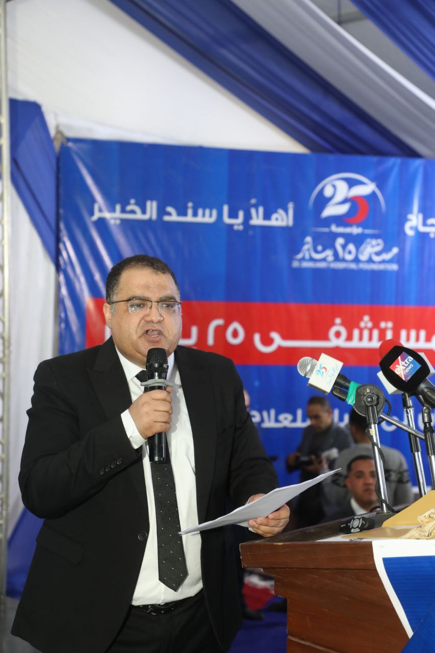 وخلال كلمته، أعرب محمد الجارحي المؤسس ونائب رئيس مجلس الأمناء ووكيل نقابة الصحفيين،عن فخره بتحويل الحلم إلى واقع، موضحاً أن مؤسسة ٢٥ يناير مؤسسة غير هادفة للربح، مشهرة مركزياً بالإدارة المركزية للجمعيات والمؤسسات بوزارة التضامن الاجتماعي برقم 796 لسنة 2017، ويرتكز نشاطها على إنشاء المستشفيات والمراكز الطبية والعيادات المتخصصة، والمساهمة في تطويرها ومتابعتها، فضلاً عن تقديم الخدمات الطبية بالمجان للأسر الأولى بالرعاية.