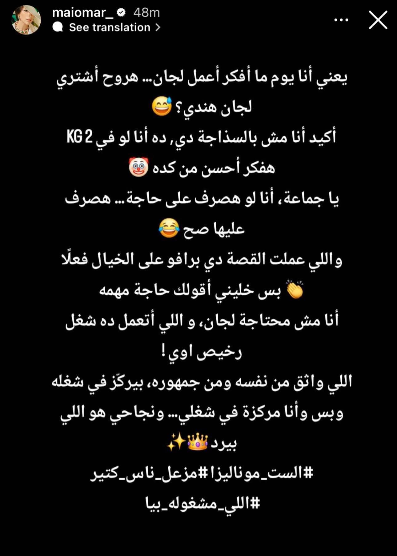 وكتبت مي عمر عبر صفحته على موقع التواصل الاجتماعي إنستجرام عبر خاصية :"يعني أنا يوم ما أفكر أعمل لجان هروح أشتري لجان هندي؟ واللي عمل القصة دي برافو على الخيال فعلًا، بس خليني أقولك أنا مش محتاجة لجان، واللي اتعمل ده شغل رخيص، واللي واثق من نفسه ومن جمهوره بيركز في شغله ونجاحي هو اللي بيرد، الست موناليزا مزعل ناس كتير".