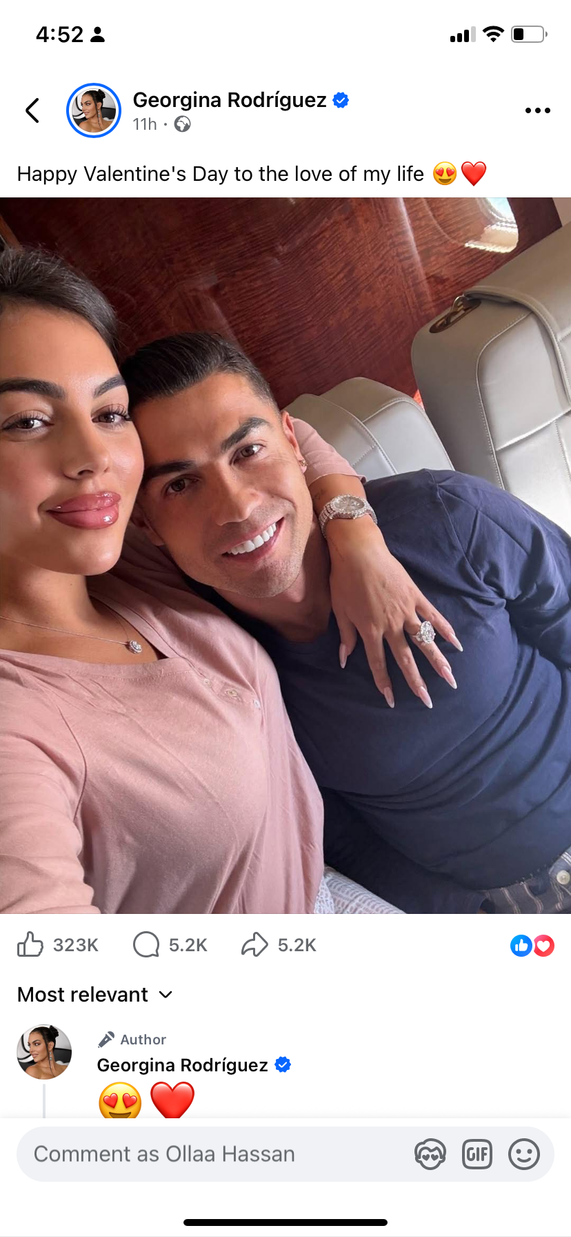 شاركت جورجينا رودريجيز عارضة الأزياء صورة مع زوجها نجم كرة القدم البرتغالى كريستيانو رونالدو بمناسبة عيد الحب.
